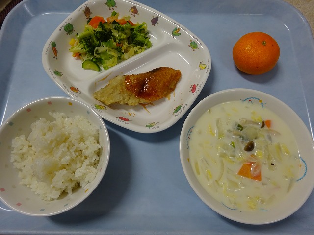 12月3日(水)給食 ・ごはん ・さわらの甘酢あん ・コーンサラダ(コーン・キャベツ・きゅうり・にんじん・ブロッコリー) ・白菜ミルクスープ(白菜・玉ねぎ・にんじん・しめじ・牛乳) ・みかん