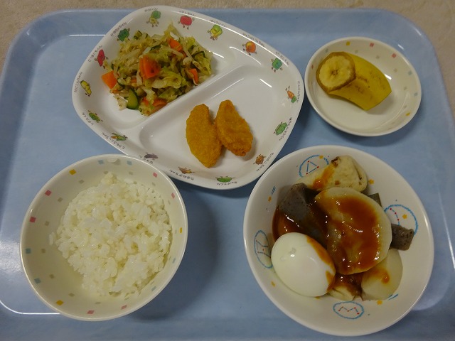 12月4日(水)給食 ・ごはん ・みそおでん(卵・だいこん・こんにゃく・ちくわ・昆布・みそ) ・キャベツのおかかあえ(キャベツ・きゅうり・にんじん・もやし・かつお節) ・チキンナゲット ・バナナ