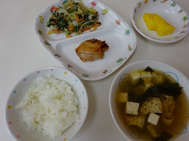 12月5日(木)給食 ・ごはん ・鶏肉の香味焼き ・おわりおひたし(ほうれん草・キャベツ・もやし・にんじん・ツナ) ・さつまいもみそ汁(豆腐・油揚げ・さつまいも・玉ねぎ・わかめ) ・パイナップル