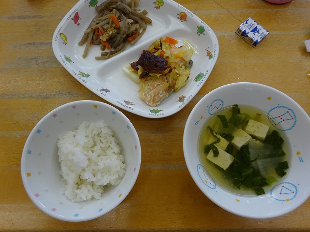 12月11日(水)給食 ・ごはん ・鮭のちゃんちゃん焼き(鮭・玉ねぎ・キャベツ・にんじん・しめじ・みそ) ・五目きんぴら(ごぼう・れんこん・にんじん・油揚げ・いんげん・こんにゃく・ごま) ・すまし汁(豆腐・こまつな・だいこん・ねぎ) ・チーズ