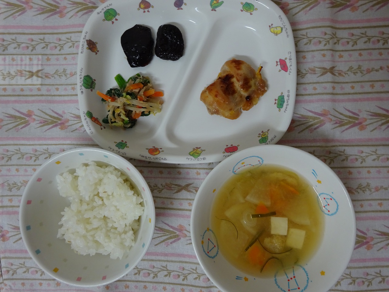 4月9日(火)給食 ・ごはん ・鶏肉のマーマレード焼き ・かわりおひたし ・みそ汁 ・プルーン