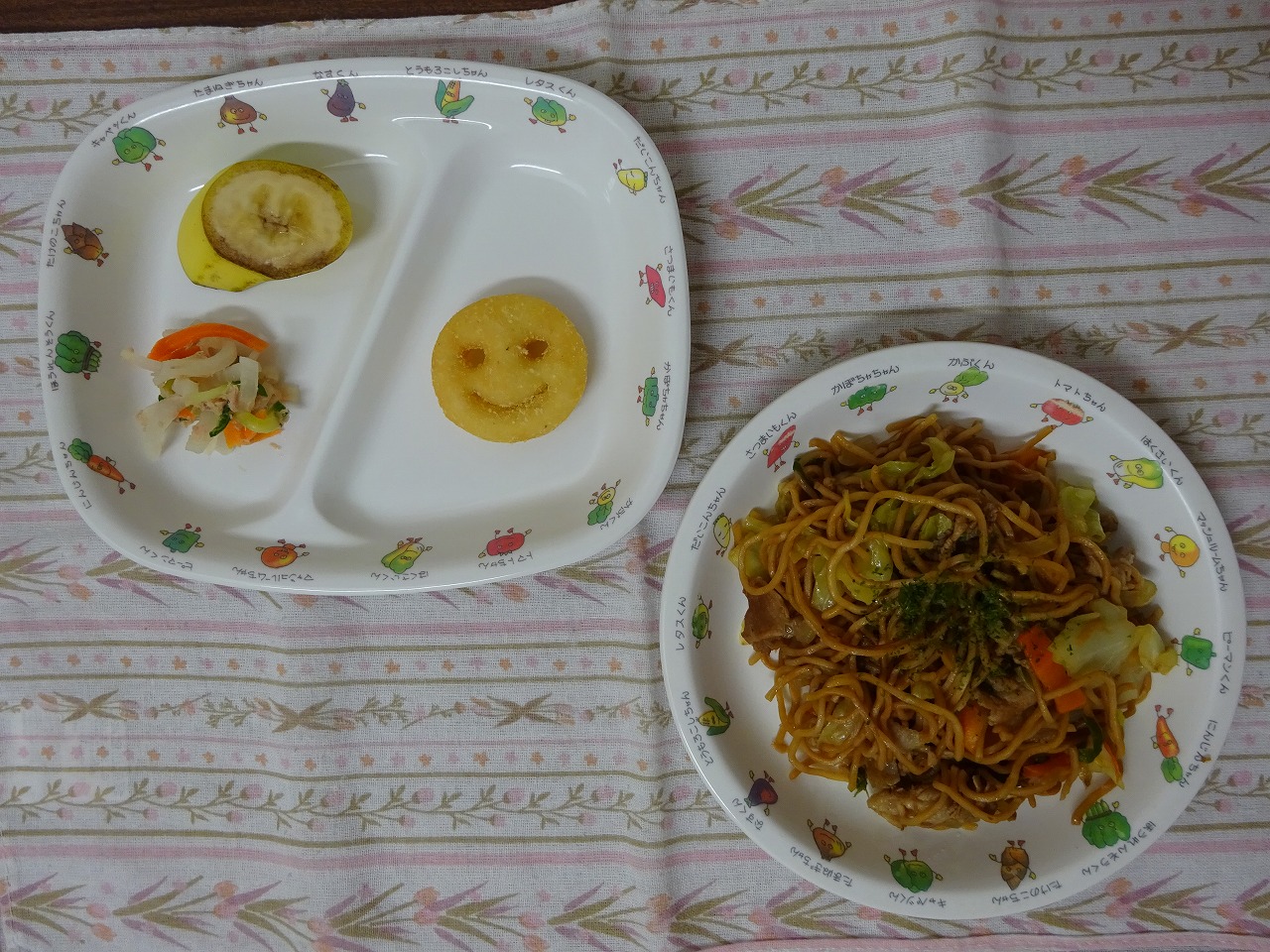 4月11日(木)給食 ・焼きそば ・スマイルポテト ・大根サラダ ・バナナ