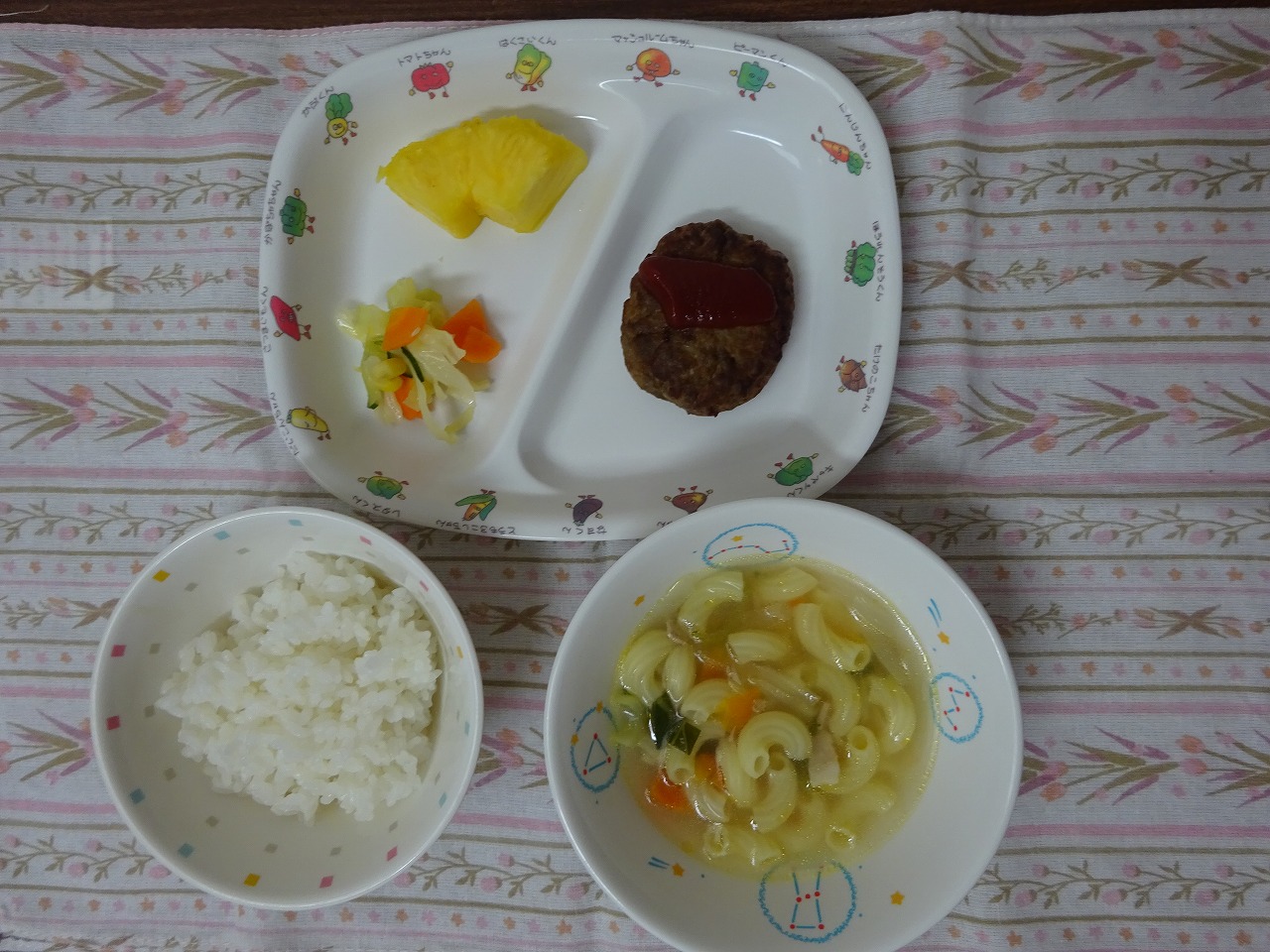 4月12日(金)給食 ・ごはん ・ハンバーグ(ケチャップ) ・フレンチサラダ ・マカロニスープ ・パイナップル