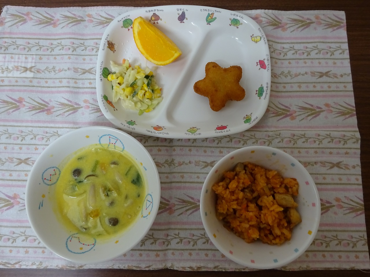 4月15日(月)給食 ・ケチャップライス ・星のコロッケ ・コールスローサラダ ・豆乳スープ ・オレンジ