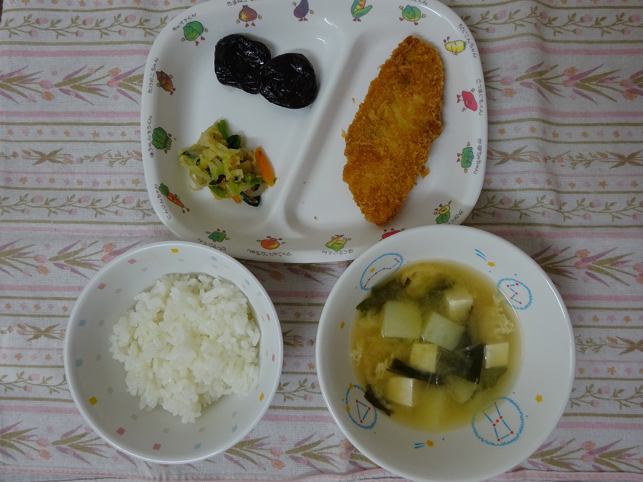 4月17日(水)給食 ・ごはん ・白身魚フライ ・小松菜のおかか和え ・みそ汁 ・プルーン