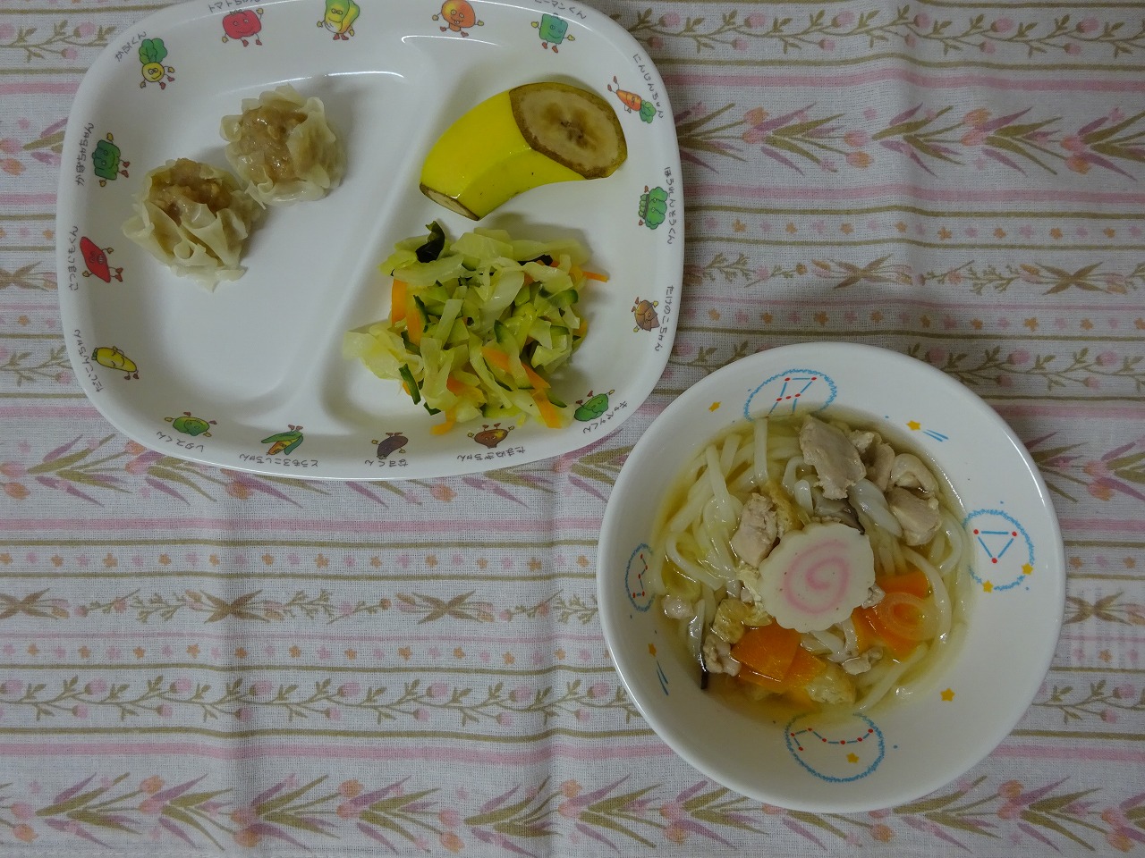 4月18日(木)給食 ・煮込みうどん ・豚肉シューマイ ・胡瓜の酢の物 ・バナナ