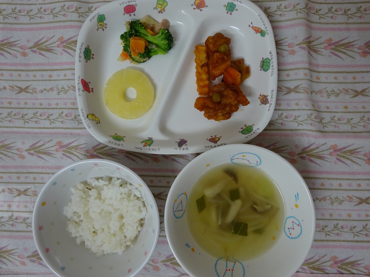 4月19日(金)給食 ・ごはん ・かしわのノルウェー煮 ・ツナサラダ ・コンソメスープ ・ベビーパイン