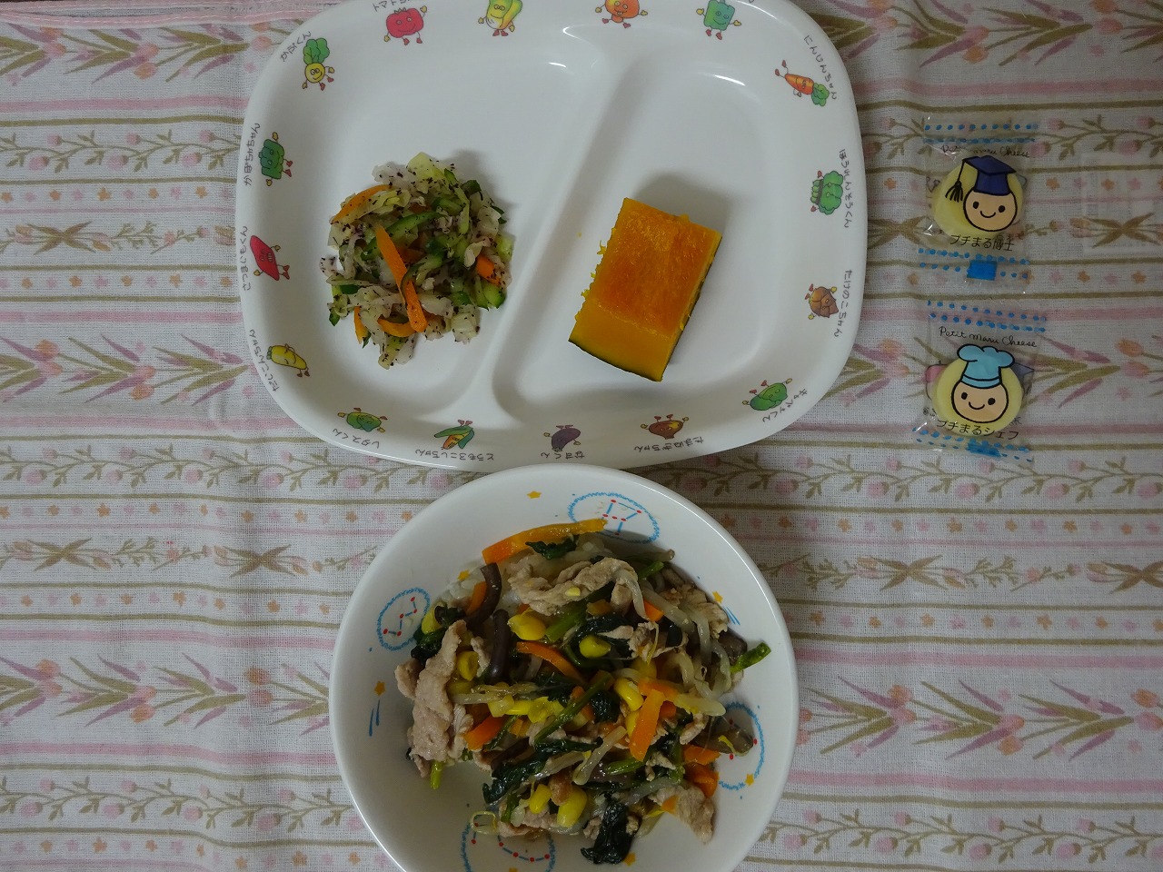 4月22日(月)給食 ・ビビンバ ・南瓜の甘煮 ・ゆかり和え ・チーズ