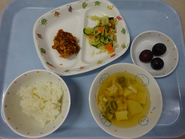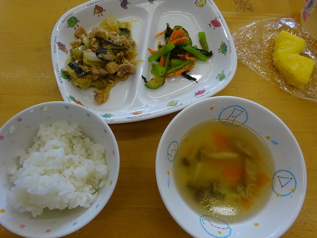 9月6日(金)給食 ・ごはん ・鶏ちゃん風炒め(鶏肉・キャベツ・玉ねぎ・にら・みそ) ・梅かつおあえ(きゅうり・にんじん・こまつな) ・ABCスープ(マカロニ・ウインナー・にんじん・しめじ・ねぎ) ・パイナップル