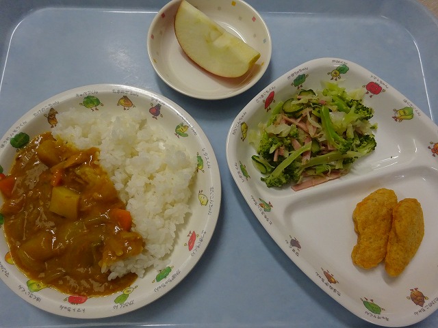 9月9日(月)給食 ・ツナカレーライス(ツナ・じゃがいも・玉ねぎ・にんじん・ピーマン) ・グリーンサラダ(キャベツ・きゅうり・ブロッコリー・ハム) ・チキンナゲット ・りんご