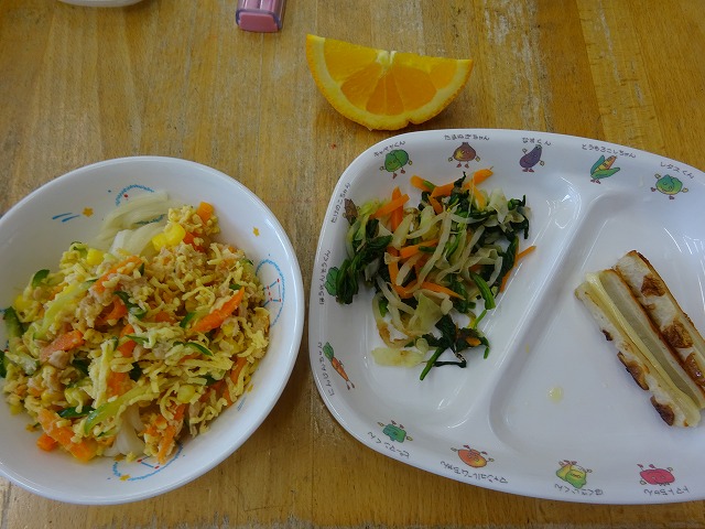 9月10日(火)給食 ・サラダうどん(麺・ツナ・卵・きゅうり・にんじん・コーン) ・ちくわのマヨ焼き(ちくわ・マヨドレ) ・ほうれん草のおひたし(ほうれん草・キャベツ・もやし・にんじん) ・オレンジ