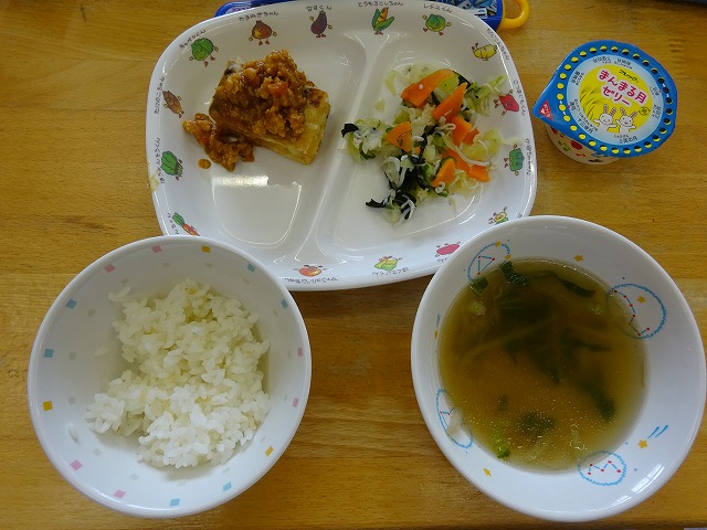 9月13日(金)給食 ・ごはん ・焼き豆腐の鶏みそかけ(焼き豆腐・鶏ひき肉・にんじん・たまねぎ・みそ) ・きゅうりの酢の物(きゅうり・キャベツ・にんじん・しらす干し・わかめ) ・はるさめスープ(はるさめ・ちんげん菜・玉ねぎ・もやし) ・ゼリー