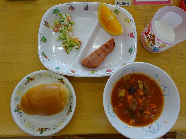 9月24日(火)給食 ・パン ・ハムステーキ串 ・コールスローサラダ(キャベツ・きゅうり・にんじん・かにかま) ・ミネストローネ(ベーコン・玉ねぎ・にんじん・ピーマン・じゃがいも・なす) ・オレンジ
