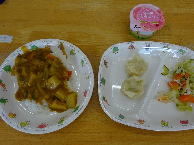 8月19日(月)給食 ・シーフードカレーライス(米・えび・いか・あさり・じゃがいも・玉ねぎ・にんじん・ピーマン) ・キャベツの甘酢あえ(キャベツ・きゅうり・にんじん・しらす干し) ・枝豆シューマイ ・ももゼリー
