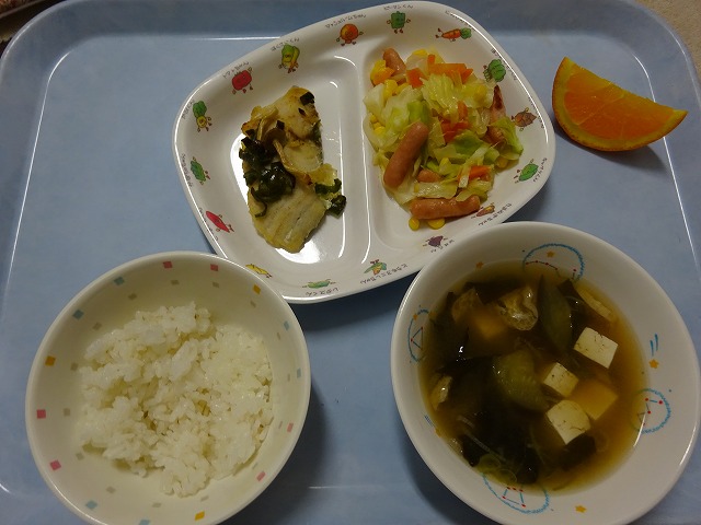 8月21日(水)給食 ・ごはん ・さわらのオーブン焼き(さわら・玉ねぎ・ピーマン・しめじ) ・いろどりソテー(ウインナー・キャベツ・玉ねぎ・にんじん・コーン) ・みそ汁(豆腐・油揚げ・なす・玉ねぎ・わかめ・ねぎ) ・オレンジ