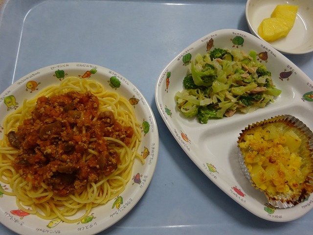 8月22日(木)給食 ・ミートスパゲティ(麺・豚挽肉・玉ねぎ・にんじん・ピーマン・マッシュルーム) ・グリーンサラダ(ブロッコリー・キャベツ・きゅうり・ツナ) ・じゃがいものココット焼き(じゃがいも・玉ねぎ・ベーコン・コーン・パセリ・チーズ) ・パイナップル