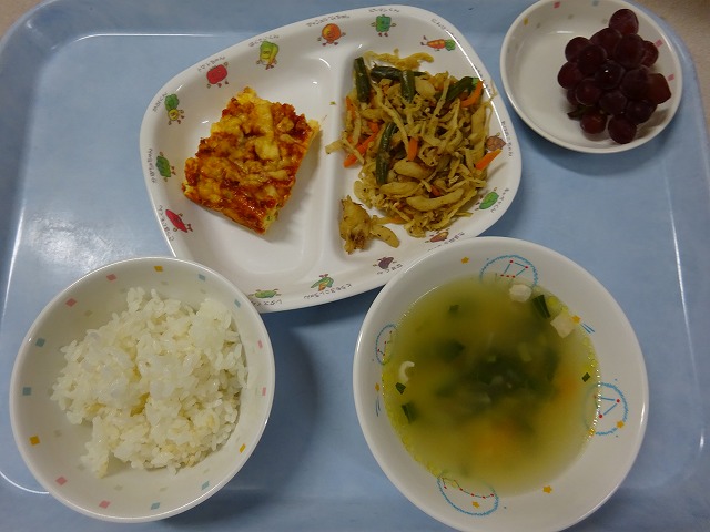 8月23日(金)給食 ・ごはん ・ピザ風オムレツ(卵・ベーコン・ピーマン・玉ねぎ・コーン・チーズ) ・切干大根の煮物(切干大根・安平揚げ・ちくわ・いんじん・にんじん・ごま油) ・コンソメスープ(鶏肉・玉ねぎ・にんじん・ちんげん菜) ・ぶどう