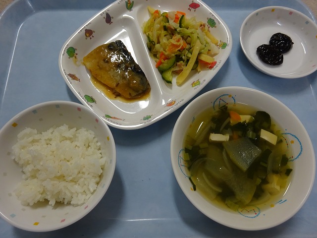 8月29日(木)給食 ・ごはん ・さばのみそ煮 ・しょうゆフレンチ(キャベツ・きゅうり・にんじん・ハム・フライドポテト) ・とうがん汁(とうがん・豆腐・こまつな・玉ねぎ・にんじん) ・プルーン