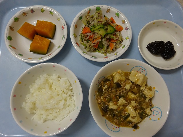 9月2日(月)給食 ・ごはん ・マーボーなす(なす・豆腐・豚挽き肉・にんじん・ねぎ・みそ・ごま油) ・キャベツのゆかりあえ(キャベツ・きゅうり・にんじん・ゆかり) ・かぼちゃの甘煮 ・プルーン