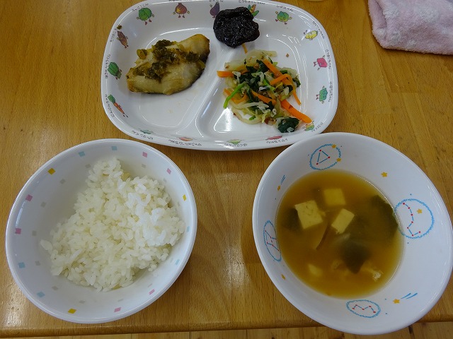 7月18日(木)給食 ・ごはん ・さわらの薬味だれ(さわら・ねぎ・しょうが・ごま油) ・ほうれん草のおかかあえ(ほうれん草・キャベツ・もやし・にんじん・かつお節) ・プルーン
