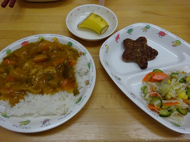 7月22日(月)給食 ・夏野菜カレーライス(米・豚肉・なす・かぼちゃ・玉ねぎ・にんじん・ピーマン・トマト) ・フレンチサラダ(キャベツ・きゅうり・にんじん・かにかまぼこ) ・星のハンバーグ ・バナナ