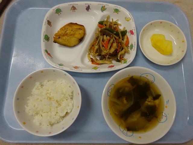 7月23日(火)給食 ・ごはん ・さばの塩焼き ・五目きんぴら(ごぼう・にんじん・ちくわ・いんげん・こんにゃく・ごま) ・みそ汁(豆腐・油揚げ・キャベツ・玉ねぎ・わかめ・みそ) ・バナナ
