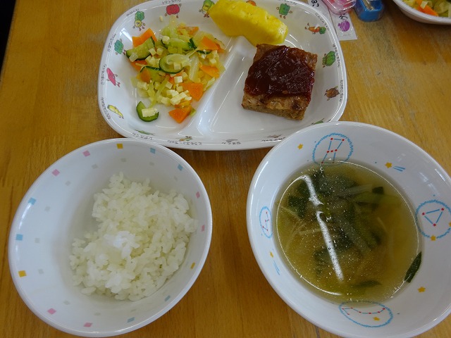 4月12日(金) 給食 ・ごはん ・ミートローフ(合挽肉・玉ねぎ・にんじん・グリンピース・卵・パン粉・牛乳) ・チーズサラダ(チーズ・キャベツ・きゅうり・にんじん) ・はるさめスープ(マロニー・ちんげん菜・玉ねぎ・えのきたけ) ・パイナップル