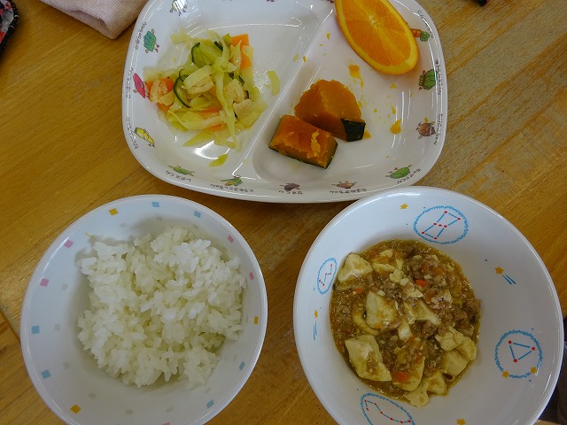 4月15日(月)給食 ・ごはん ・マーボー豆腐(豆腐・豚挽き肉・ねぎ・にんじん・干ししいたけ・しょうが・にんにく・みそ) ・チップスサラダ(ポテトチップス・キャベツ・きゅうり・にんじん) ・かぼちゃの甘煮 ・オレンジ