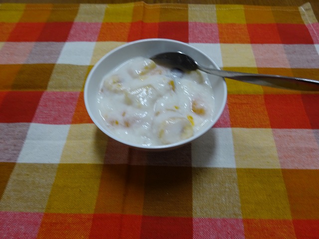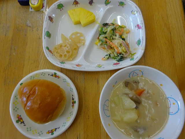 4月26日(金)給食 ・ロールパン ・クリームシチュー(鶏肉・じゃがいも・玉ねぎ・にんじん・牛乳・バター) ・ほうれん草とハムのサラダ(ほうれん草・キャベツ・にんじん・コーン・ハム) ・れんこんチップス ・パイナップル