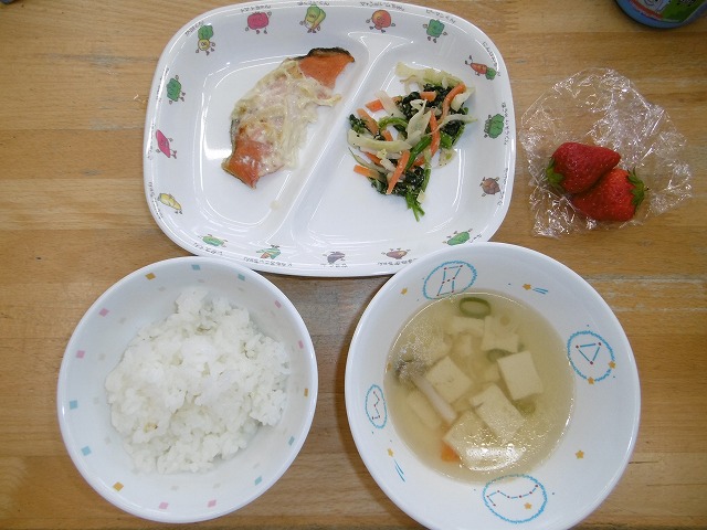 4月17日(水)給食 ・ごはん ・鮭のマヨドレ焼き(鮭・玉ねぎ・マヨドレ) ・ほうれん草ごまドレ(ほうれん草・キャベツ・もやし・にんじん・ごま) ・豆腐スープ(豆腐・しめじ・にんじん・ねぎ・しょうが・にんにく) ・いちご