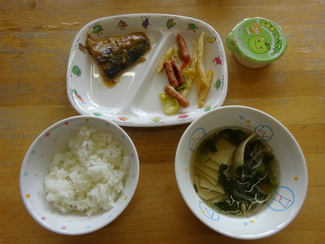 4月25日(木)給食 ・ごはん ・さばのみそ煮 ・いろどりソテー(ウインナー・キャベツ・にんじん・ピーマン・玉ねぎ・フライドポテト) ・わんたんスープ(ワンタン・こまつな・もやし・にんじん・ねぎ) ・青りんごゼリー