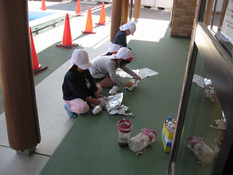 まず年中さんがさつまいもをきれいに洗ってくれました。ぼこぼこしていて、なかなかきれいになりませんでしたが、みんな一生懸命洗ってくれました。 きれいになったさつまいもを、年長さんが新聞とアルミ箔でしっかり包んでくれました。 年長さんは包んださつまいもを持ってみなみ農園へ出発しました。