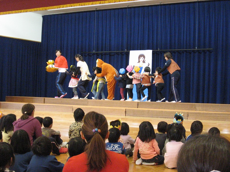 おたのしみでは、年長・年中の誕生児が参加して「金のがちょう」のオペレッタを行いました。友だちが参加していることもあり、みんな喜んで観ていました。
