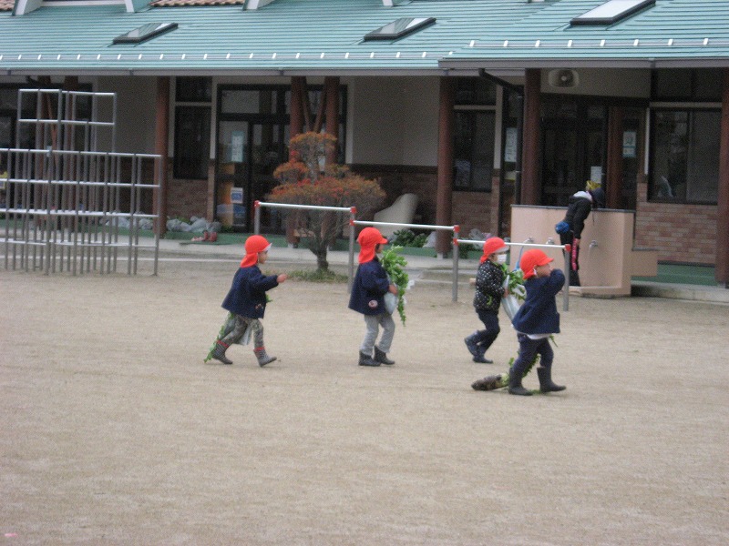 しかし、その大きな大根を保育園まで持ち帰るのがとても大変で、風が冷たく寒い日で手は冷たくて痛いし、大根は重いし・・・で泣きそうな表情の子ども達が多くいました。