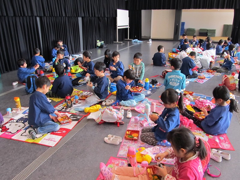 楽しく賑やかに遊んだ後は学習センターまで移動して北保育園の友達と一緒にお弁当をいただきました。