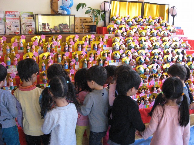 最後は毎年恒例になっている園内“がんどうち”です。正面玄関に飾られたおひなさまを「ひなさまみしとくれ〜」と言って自分や友達のおひなさまを見ていました。そして、園長先生からおやつをもらってニコニコの子ども達でした。