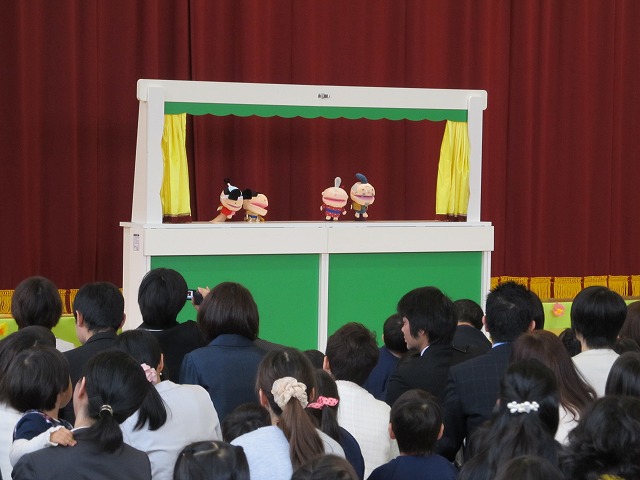年中、年長の担任から名前を呼ばれると元気よくステージに上がり、新入園児へ歌のプレゼントをしました。