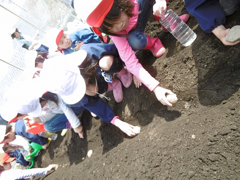 とても良い天気の今日、先日農園開きをしたみなみ農園の畑にじゃがいもを植えました。 14列の畝に年中さんと年長さんがペアで並び、畑の先生に植え方を教えてもらいました。 その後、年長さんが包丁で半分に切ったじゃがいもの種芋をペアで半分ずつにして、芋の切口に芋が腐らないように灰をつけ、土の中に優しく植えました。
