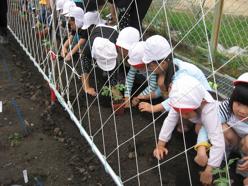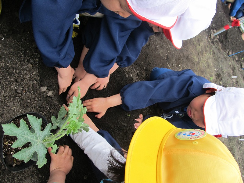 年長さんは昨年度に引き続き今年度もスイカを育てることにしました。 畑の先生中田さんに植え方を教わると、4〜5名のグループで1つの苗を植えるため、15cm程の穴を手で掘りました。 苗を植え、土をかぶせるとペットボトルで作ったジョーロで水をたっぷりかけました。 今年はフェンスを利用してつるを上へ這わせるよう網のトンネルを設置しました。