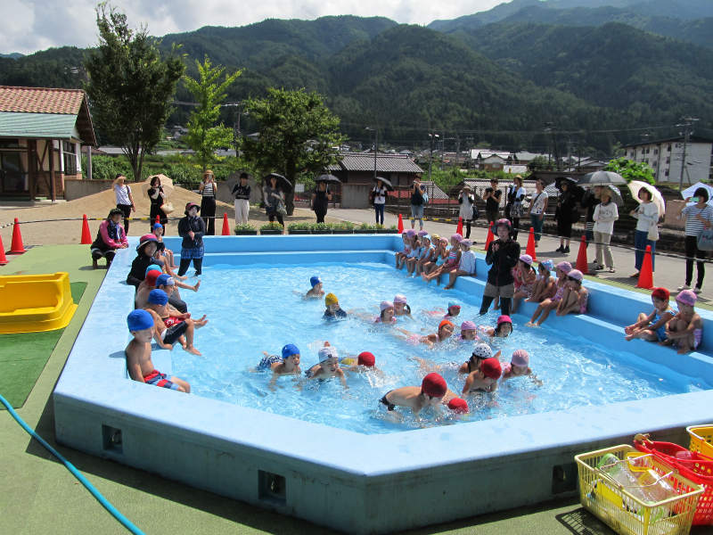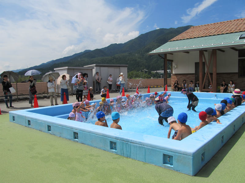 朝は曇っていましたが、体操をする頃には日差しも出てきて夏らしい天気の中、プール参観を行うことができました。 顔をつけたりワニ泳ぎをしたり水かけっこをしたりと年少さんの時より水に慣れて、自分から挑戦する姿を見てもらえました。