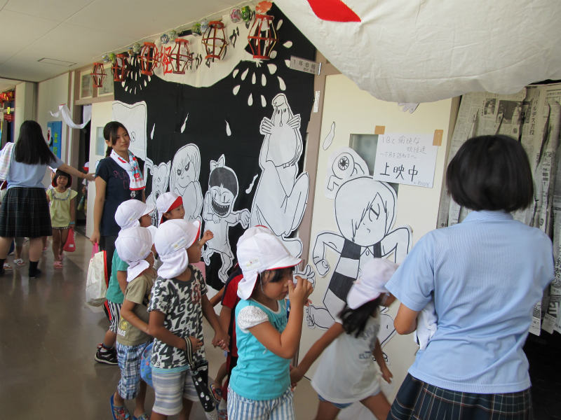 益田清風高校の文化祭を見せてもらいに行ってきました。 高校生のお兄さんお姉さんがグループ毎に連れて回ってくださり、いろいろな飾り付けをしてある教室を楽しく見せてもらいました。 よく知っているアニメのキャラクターに喜んだり、とても上手に作ってある作品に驚いたりと子ども達は大喜びでした。