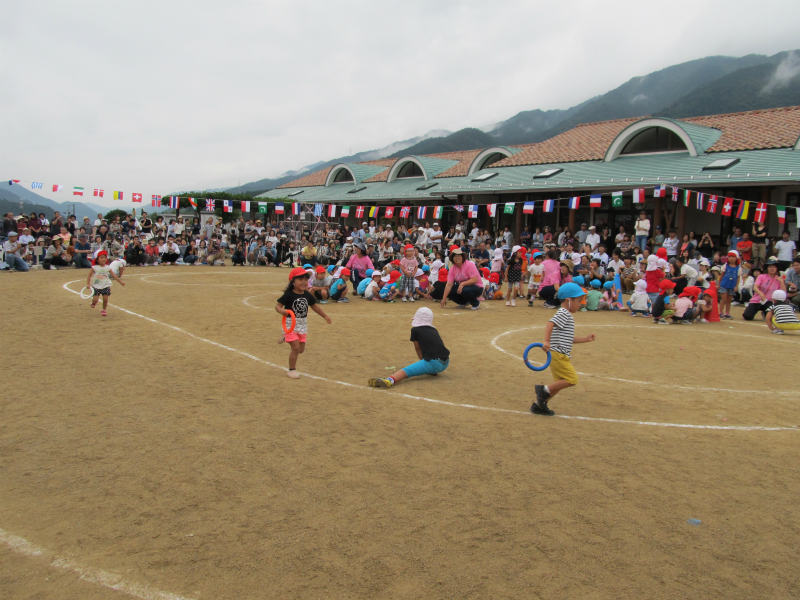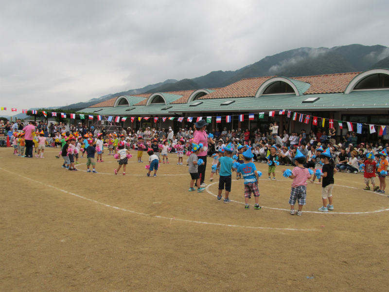 年少さんにとって初めての運動会、ドキドキ、ワクワクで迎えた当日は、あまりの人の多さに少し緊張気味の子ども達。でもいざ始まるとお家の人に素敵なところを見てもらいたくて、張り切っている姿を見てもらえたと思います。 ハプニングもあったけど頑張って走ったかけっこ、お家の人と一緒に楽しんだ親子競技、かわいい衣装に身を包んで踊った遊戯、どれも年少さんらしくかわいい姿が見られました。