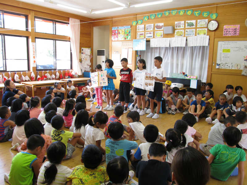 萩原小学校3年生のお兄さんお姉さんが学校での授業はどんなことがあるのか、どんな行事があってそこで何をするのかなどを楽しい劇にして教えてくれました。 年長さんの前で堂々と発表する姿に年長さん達は真剣に見入っていました。