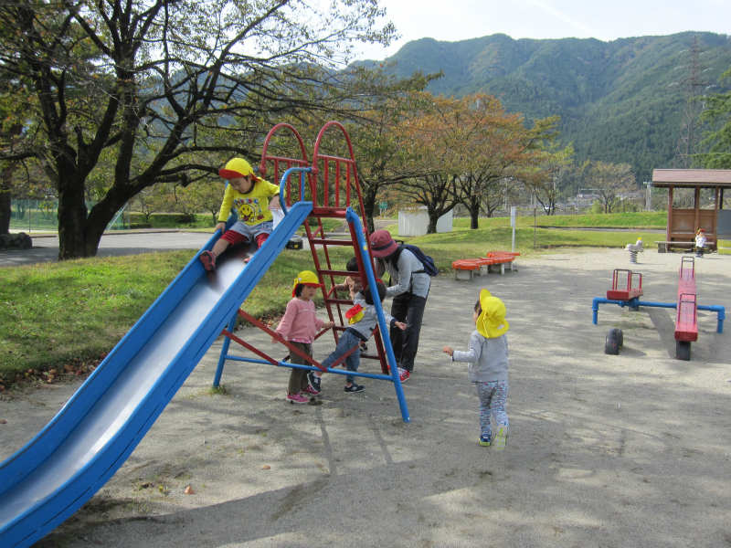 飛騨川公園に着くと、広い芝生の上を子ども達のペースでのんびり歩いたり、くぬぎの木の下でどんぐりを拾ったり、ベンチでおやつを食べたりとゆったりと遊ぶことができました。