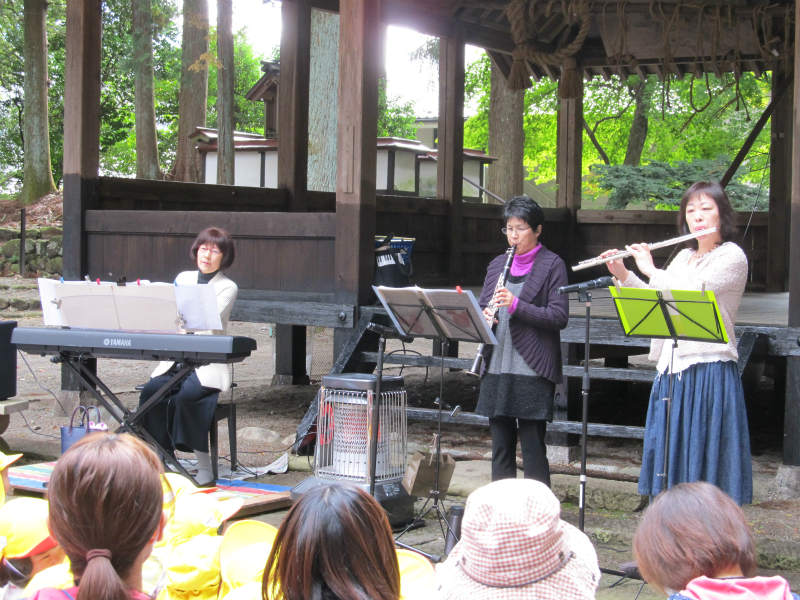 萩原子育て支援センター主催の“鎮守の森コンサート”を聴きに全園児が諏訪神社まで出かけました。 今回はフルート、クラリネットと普段あまり見ることのない楽器での演奏だったので、その音色に興味津々でした。リズムに合わせて体を揺らしたり、知っている曲だとみんなで歌って楽しんでいました。