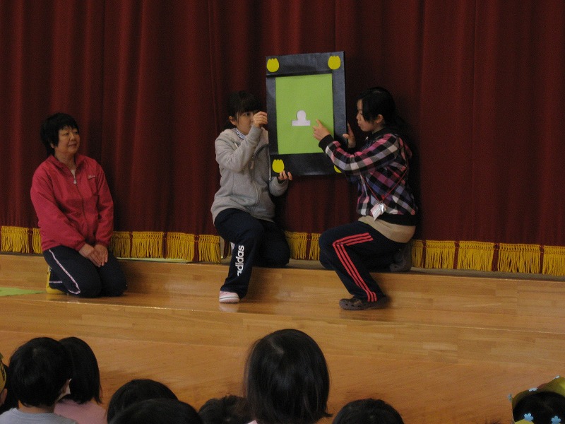 お楽しみは“おもちがぷくっとふくらんで”の紙芝居シアターでした。ふくらんだおもちが風船やタコ、雪の子ども、雪だるまに変身! 先に気付いた子ども達から「ふうせ〜ん」「タコ」など元気な声が聞こえてきました。とても楽しい誕生会となりました。