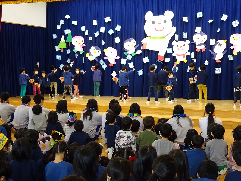 子ども達から今まで遊んでくれてありがとうの気持ちを込めて首飾りのプレゼントを行い、発表会の遊戯“まつり”を観てもらいました。お兄さんお姉さんからもステキなプレゼントをいただきました。