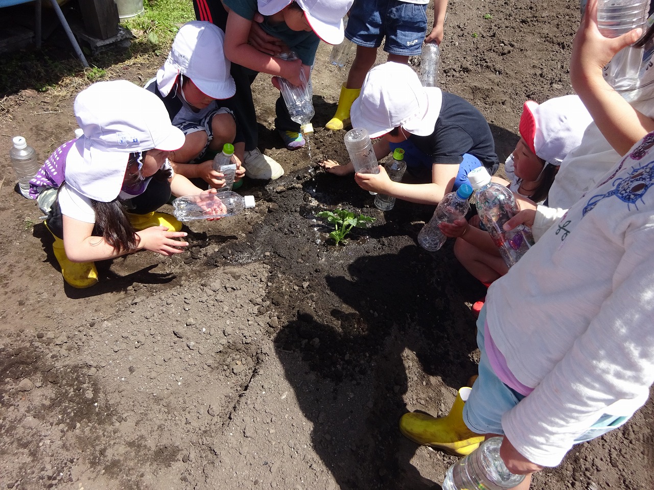少し掘った穴にまず少しだけ水をかけてから、苗を置き土をかぶせ、たくさんの水と「大きくなあれ」「おいしくなあれ」と魔法をかけてきました。