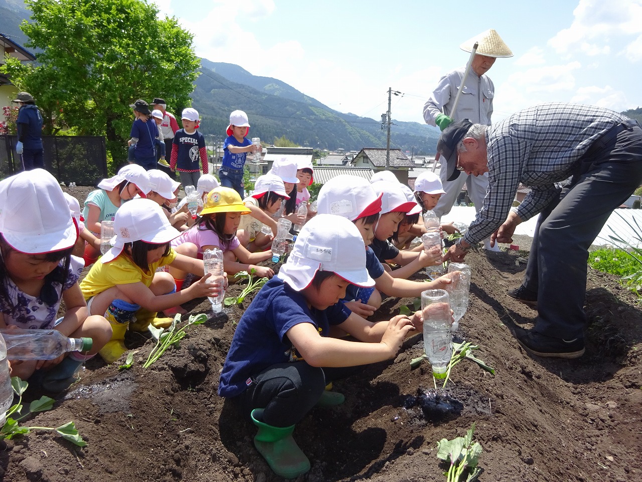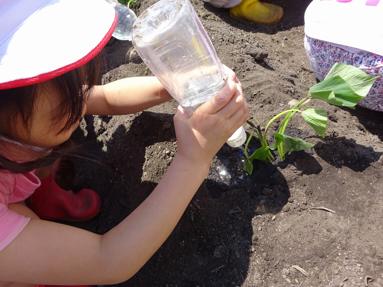 年長さんは、今年度“じゃがいも”“すいか”に続き今日はさつまいもの苗を植えました。