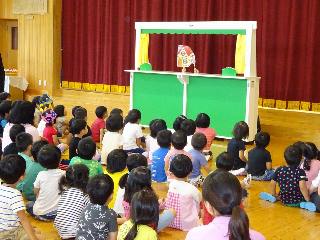 お楽しみは保育士による“三匹の子ぶたの手遊び”と“ペープサート”でした。子ども達の大好きな物語なので、次の展開を予測してワクワクしたり、お話を想像しながら楽しく観ていてくれました。